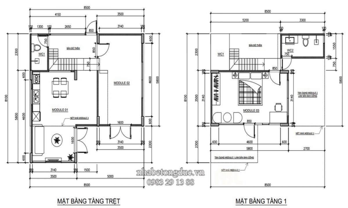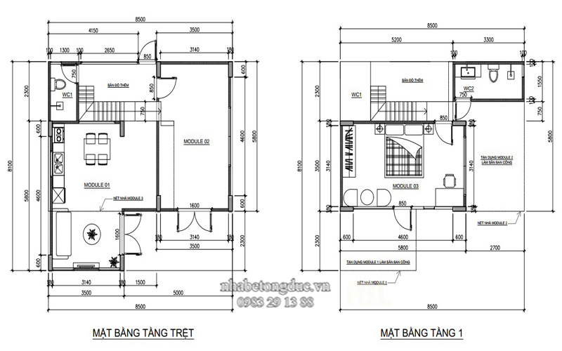 Tham khảo mẫu nhà 2 tầng 2 phòng ngủ được thiết kế từ nhà bê tông đúc sẵn. Thiết kế sử dụng 3 modules để tạo thành không gian gồm: phòng khách kết hợp bếp, 2 phòng ngủ và 2 nhà vệ sinh.