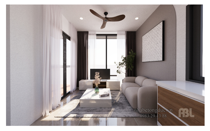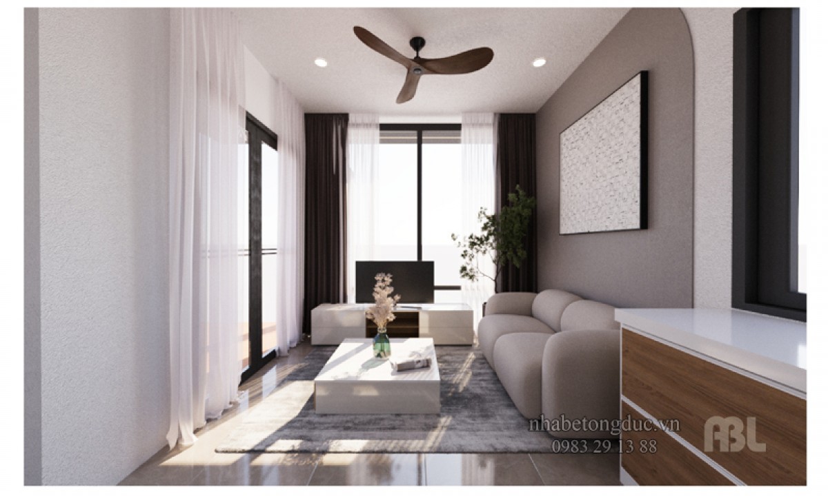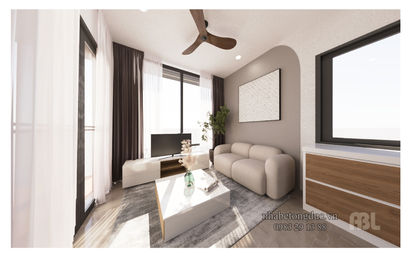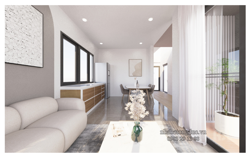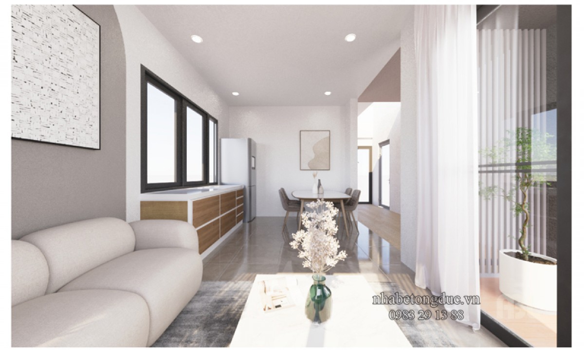 Phòng khách: đặt ở phía trước, rộng thoáng, tận dụng ánh sáng tự nhiên từ hệ cửa kính, là nơi tiếp khách và sinh hoạt chung.