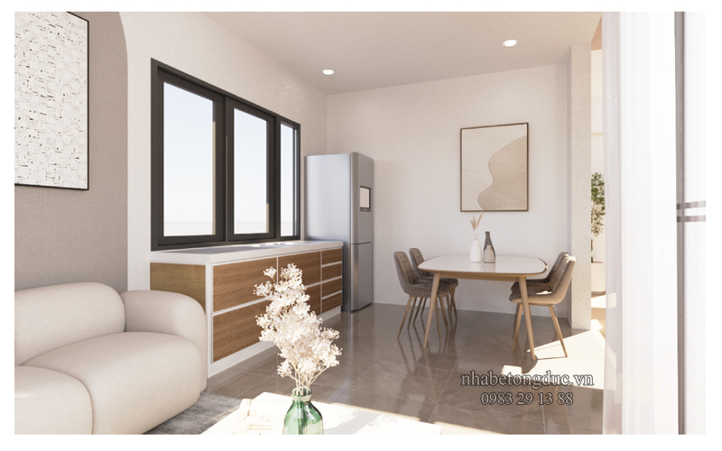 Phòng bếp + khu vực ăn uống: bố trí liền kề, thuận tiện cho gia đình quây quần trong những bữa cơm.